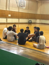 体育館はバスケコート1面とってさらに四方にスペースがある程度の広さです。ただし、他の部活動と分割して使用するため、平日は体育館の4分の1(ゴール1つ)、土日は2分の1(ゴール3つ)のスペースで活動をしています。今年度エアコンを設置しましたので、夏場は暑すぎない環境で練習ができます。
