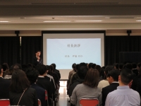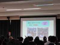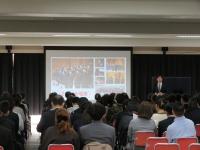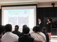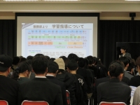 学校概要説明では、教務部より学習指導について、生活指導部より生活指導・行事・部活動について、進路指導部より進路指導についてご説明をさせていただきました。合格塾の説明では、受講している2年生の生徒2人が体験談をしてくれました。