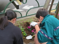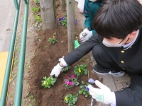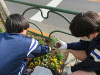 生徒会生徒や園芸部、野球部、テニス部、バドミントン部など、多くの生徒が有志で集まり本校の前の植え込みにお花を植えました。