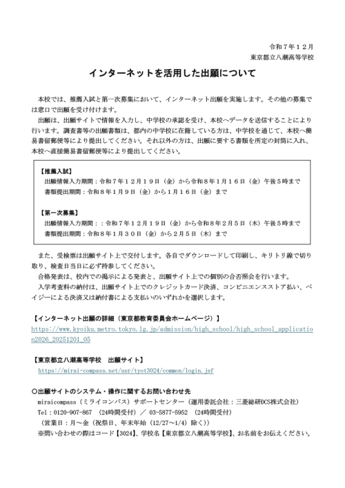 本校では、令和8年度入学者選抜の推薦入試および分割前期募集において、インターネット出願を実施します。