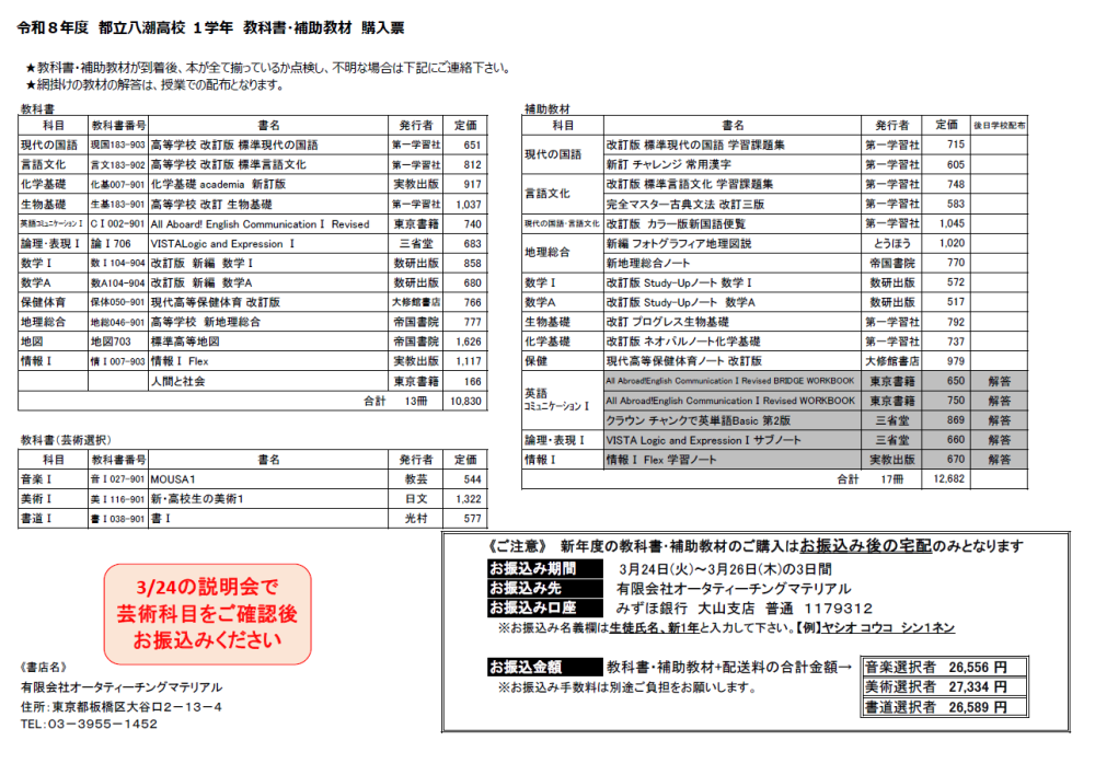 3/24の説明会で芸術科目を発表しますので、ご確認後、期間内に、記載の金額をお振込みください。