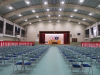 クラス替え、HRの後、部活動生徒などの協力を得て、翌日の入学式会場設営を行いました。